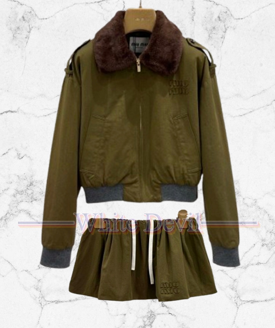 미우미우 26 이른 봄 스쿨룩 올리브 그린 재킷 스커트 세트