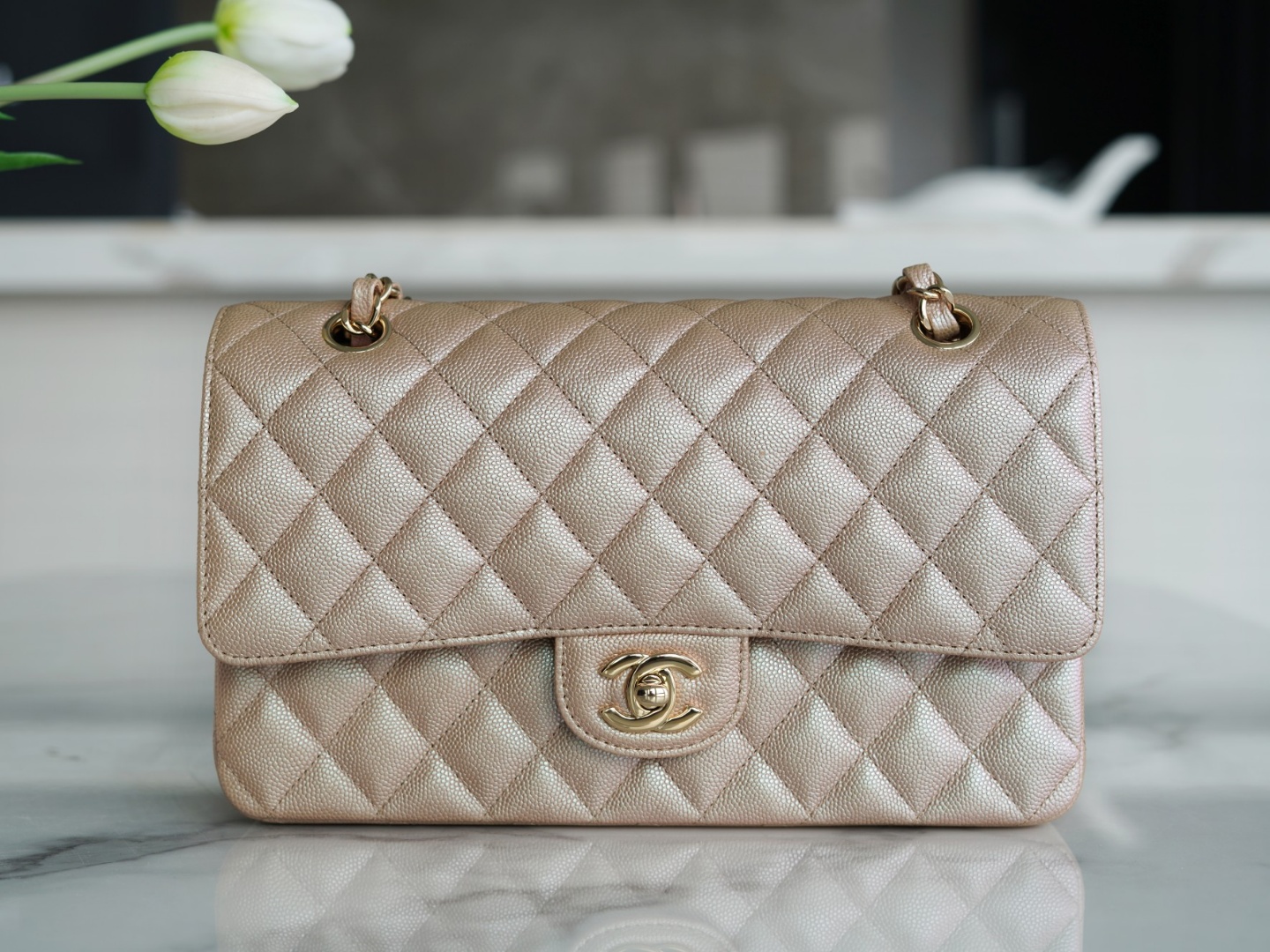 CF 오리지널 캐비어 미디엄 사이즈의 환채 샴페인 골드입니다.