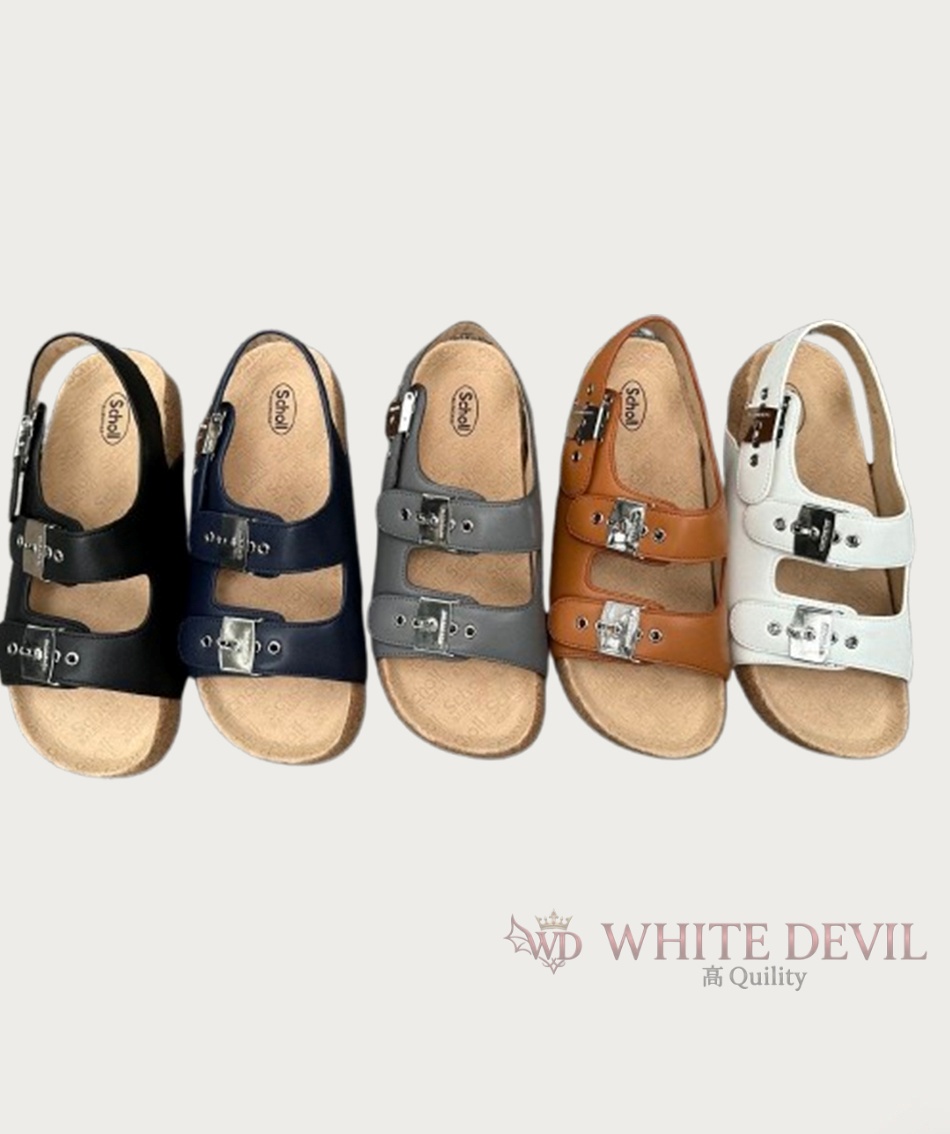 메탈릭 버클 디자인 가죽 바디 앵클 디자인 코르크 통굽