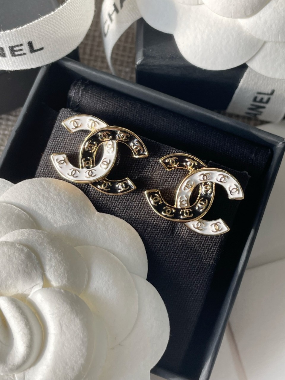 샤넬 블랙&화이트 엠보싱 골드 C 이어링