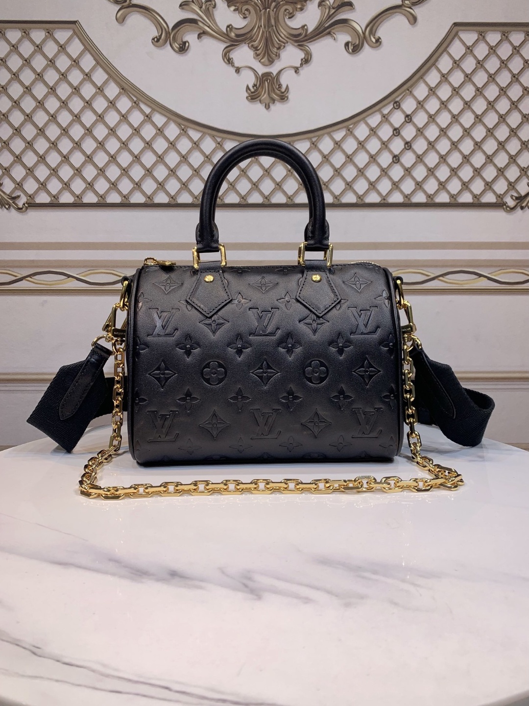모노그램 엠보싱 볼륨감 있는 양가죽으로 쿠션감을 연출